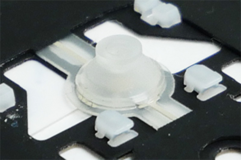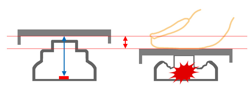 しかし、キートップの厚みを薄くすると、センサーまでの距離が遠くなるので、深く押さなければなりません。