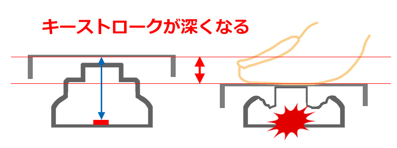 - キートップが厚い場合: 指の高さが高い → 底までの距離が稼げる → ストロークを深くできる