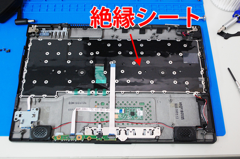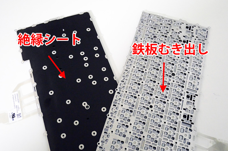 このモデルは新旧関わらず、必ず絶縁シートを付けなければ、いけませんが、一部のモデルは製造工程で絶縁シール(絶縁シート)を貼るので、キーボード鉄板むき出しのキーボードがそのまま流通しています。